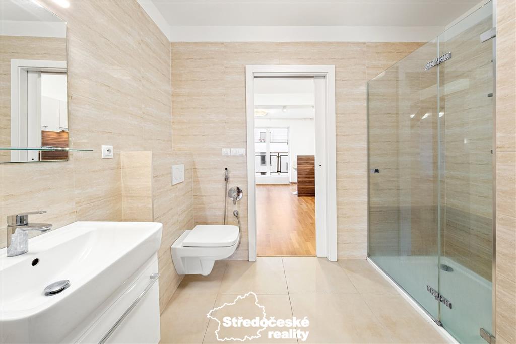 Byt byl budován tak, aby nebyl nudný, což se projevilo zejména na koupelně, která je kompletně prosklená a nachází se mezi ložnicí a obývacím pokojem. Pokud by to na Vás bylo moc, tak k dispozici je i druhé samostatné wc mimo koupelnu se vstupem z chodby.