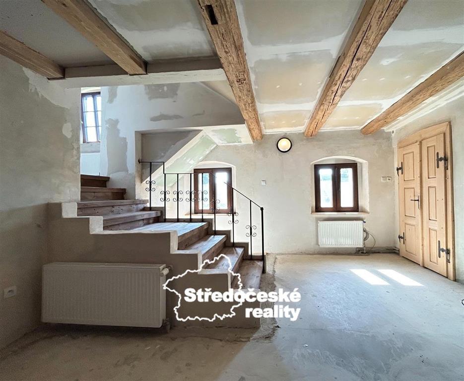 • nové omítky, zateplený strop s přiznanými trámy, sádrokarton, připravené podlahy