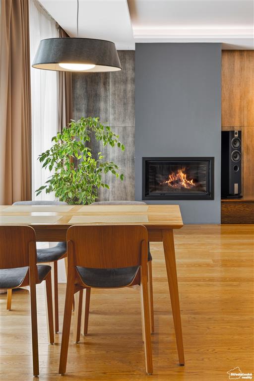 Do spodní části domu vstupujete buď hlavním vchodem, nebo z garáže. První nadzemní podlaží zahrnuje velkorysý obývací pokoj s krbem a jídelnou a samostatnou inteligentně řešenou kuchyni se spíží prosvětlenou luxferami. Samostatný pokoj slouží jako pracovna.