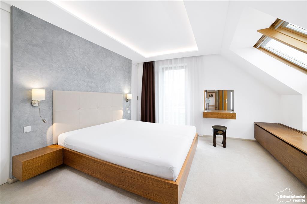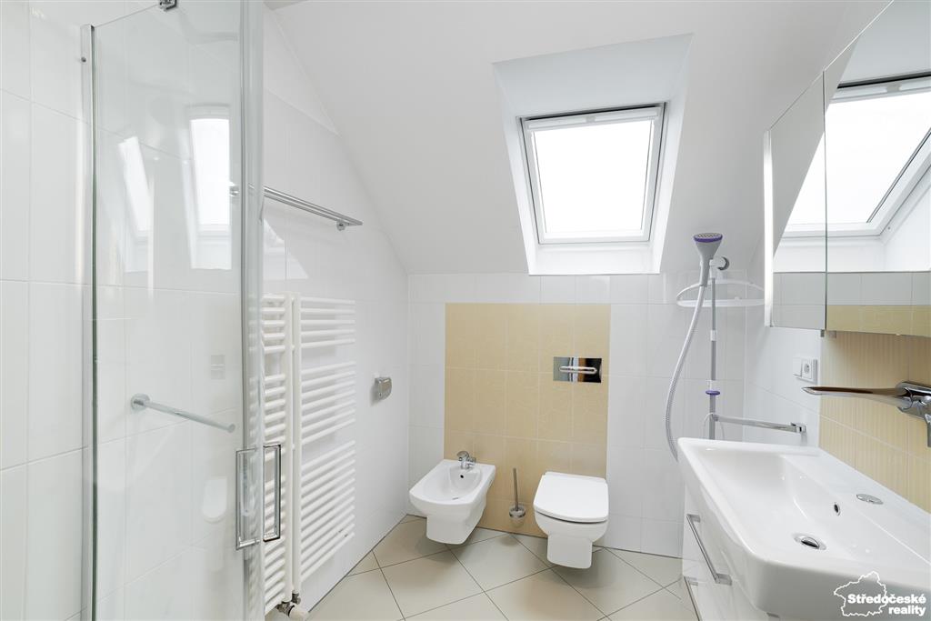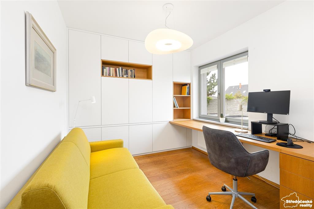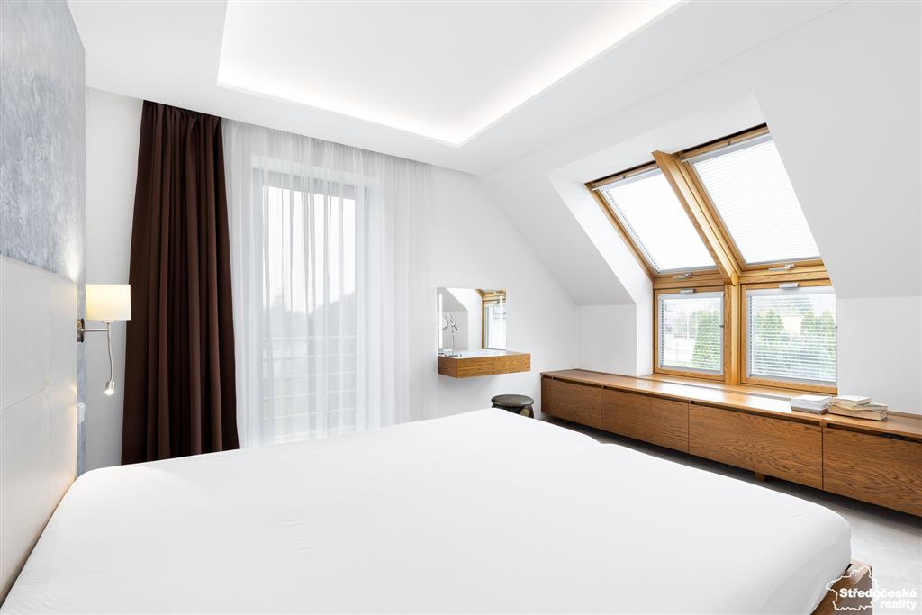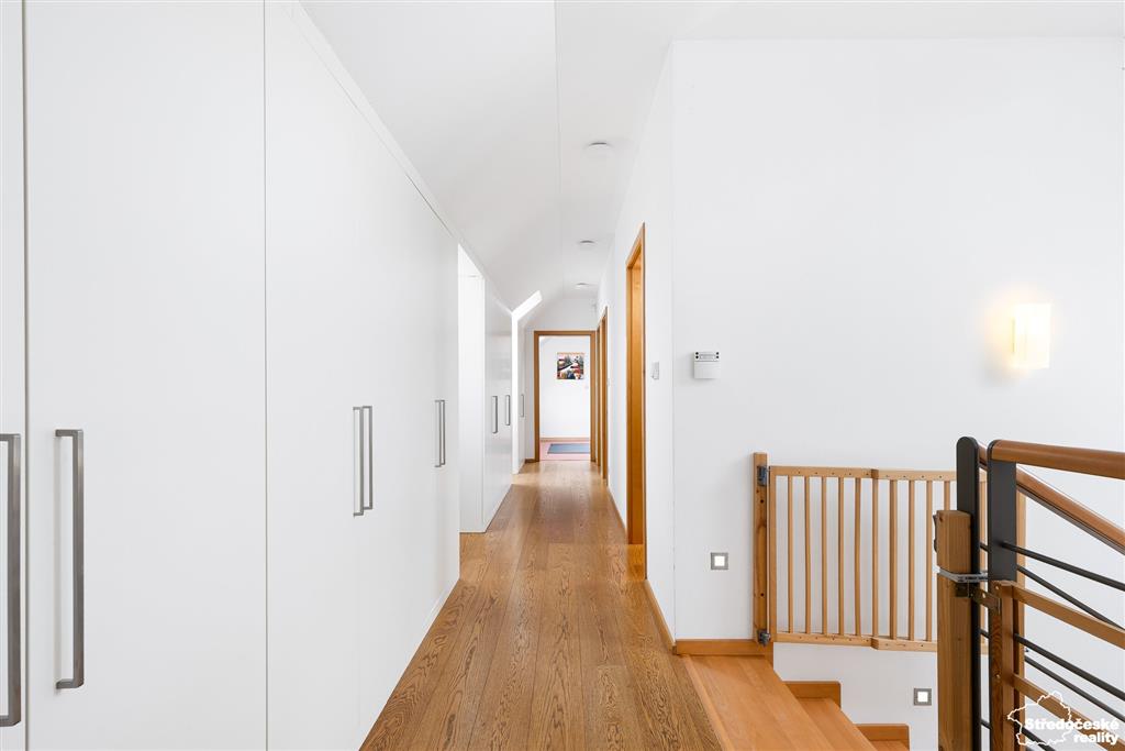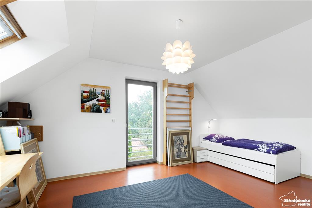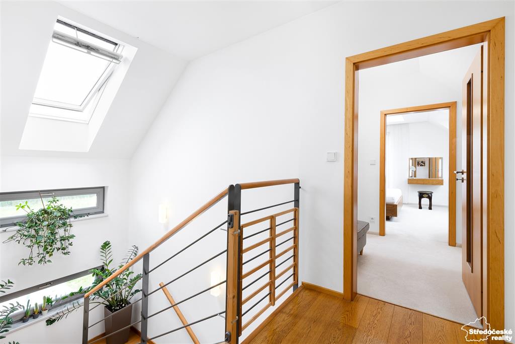 Po dřevěných schodech se dostanete do patra, kde jsou tři samostatné pokoje a dvě koupelny. Ložnice je na míru se zadní šatnou, ve spojovací chodbě jsou po celé délce vestavěné skříně. Dětský pokoj je zajímavě řešený do čela domu a je krásně prosvětlený. Poslední pokoj je kreativní dílna, případně pokoj pro hosty, nebo může sloužit jako druhý dětský pokoj.
