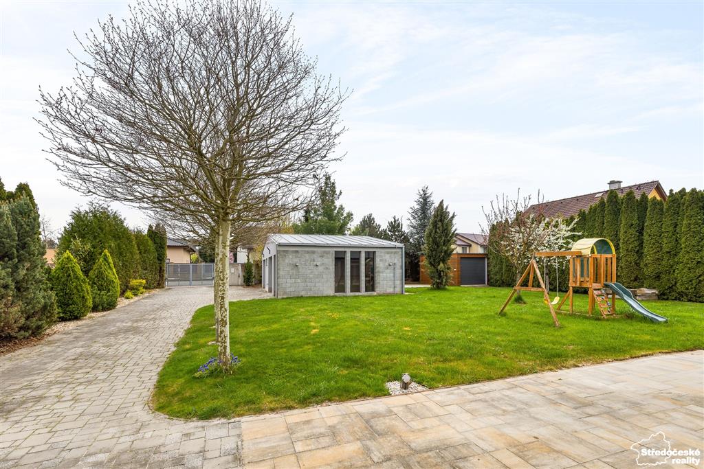 Zahrada je rozvržena do několika sekcí s automatickou závlahou trávníku. První se skládá ze vzrostlých jehličnatých stromů v čele do ulice – zde máte vlastní les a houby.